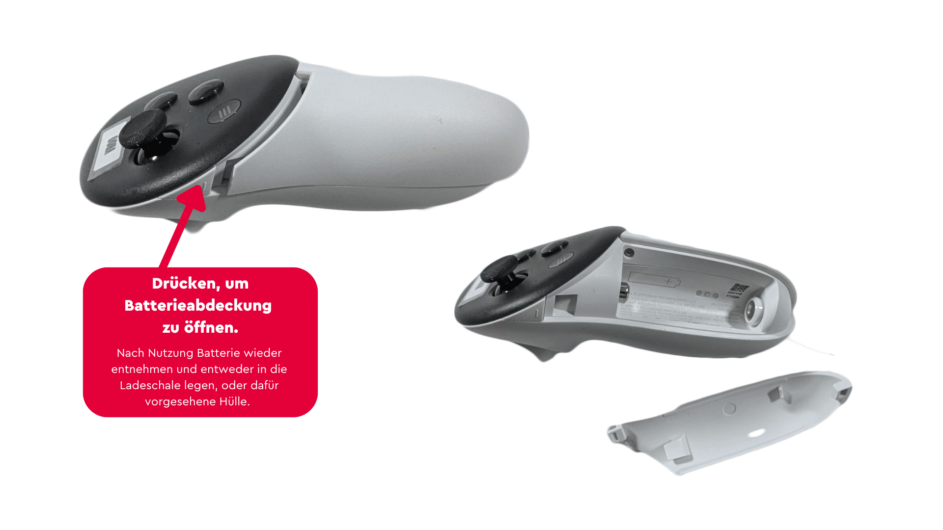Häufiger Fehler (3) Controller reagiert nicht mehr Lösung: Akkus wechseln. Dazu alten Akku entnehmen und in das Ladegerät einlegen. Neuen Akku aus der Plastikbox nehmen und in den Controller einlegen.
